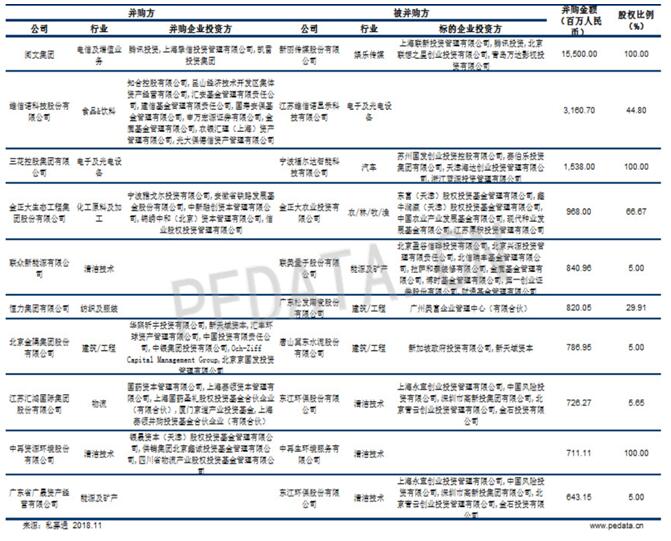 金额方面,金融行业涉及金额为211.44亿人民币,占本月总交易金额的34.1%;娱乐传媒行业涉及金额为155.00亿人民币,占25.0%;电子及光电设备行业涉及金额50.41亿人民币,占8.1%。本月发生在金融行业交易规模最大的案例为恒大集团以144.90亿人民币收购广汇集团40.96%股权一案,该案拉高了金融行业在本月统计中的整体水平。