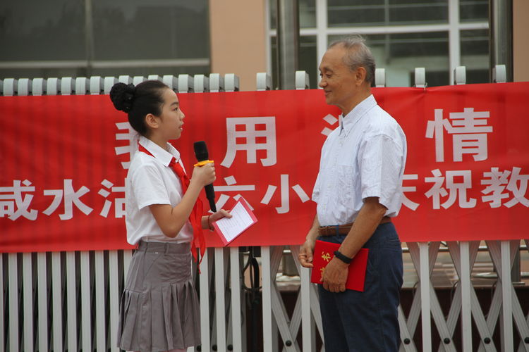 有一种付出,叫做奉献;有一种精神,叫做坚韧;有一种习惯,叫做优秀。而有一种责任,叫做守护。这,也许就是教师职业的真谛。咸水沽第六小学庆祝教师节主题升旗仪式就为我们展现了六小师生对于教师这一光荣形象的解读。仪式在庄严的国歌声中拉开序幕。之后少先队员代表为教师致以节日献词:《浓浓尊师意,款款爱生情》。稚嫩的童音包含了对老师的感激和爱戴。新加入六小大家庭的乔志新老师代表新教师发言。而后百花文艺出版社副总编辑、当代著名散文家谢大光先生应邀担任我校阅读课程指导顾问。张校长为谢先生颁发聘书。小主持人何曼琪采访了谢先生。谢先生表示,愿意和六小的孩子们一起成长,一起在六小这片乐土上播种希望,收获成长。在谢先生发言后,孙浩庭同学走上前来,以一首《老师的目光》表达对谢先生及六小全体教师的谢意。